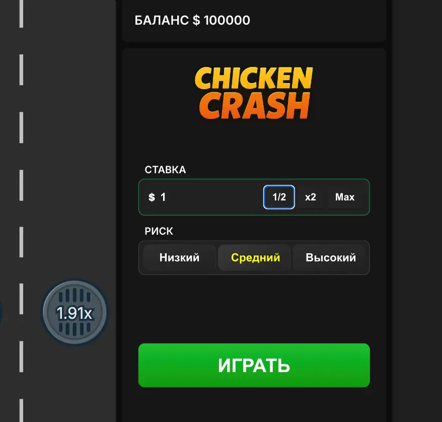 Высокий риск — настоящий адреналиновый режим Chicken Crash. Здесь каждый шаг чувствуется как прыжок через пропасть: либо множитель взлетает так, что хочется держать ставку до последнего, либо раунд обрывается резко и без предупреждений. Этот уровень выбирают игроки, которые приходят ради эмоций — и готовы принимать последствия. Потенциальные коэффициенты впечатляют, но нервная система после нескольких раундов явно просит воды.
