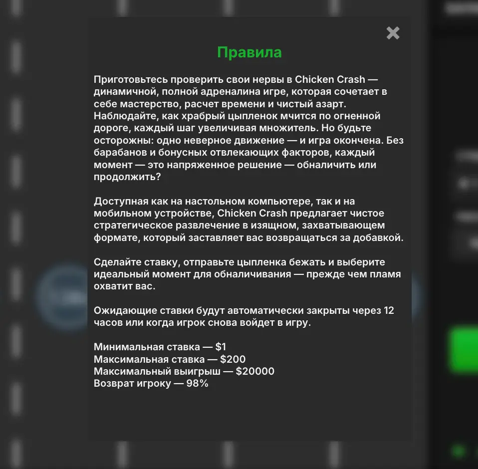 Каждый раунд — маленькая дуэль между желанием «подождать ещё секунду» и страхом всё потерять. Иногда множитель идёт плавно и спокойно, иногда взлетает рывками — именно эта непредсказуемость и делает Chicken Crash захватывающим. Если всё сделать вовремя, баланс приятно радует: максимальный выигрыш достигает $20 000, а RTP в 98% помогает игре ощущаться честной и ровной на дистанции.