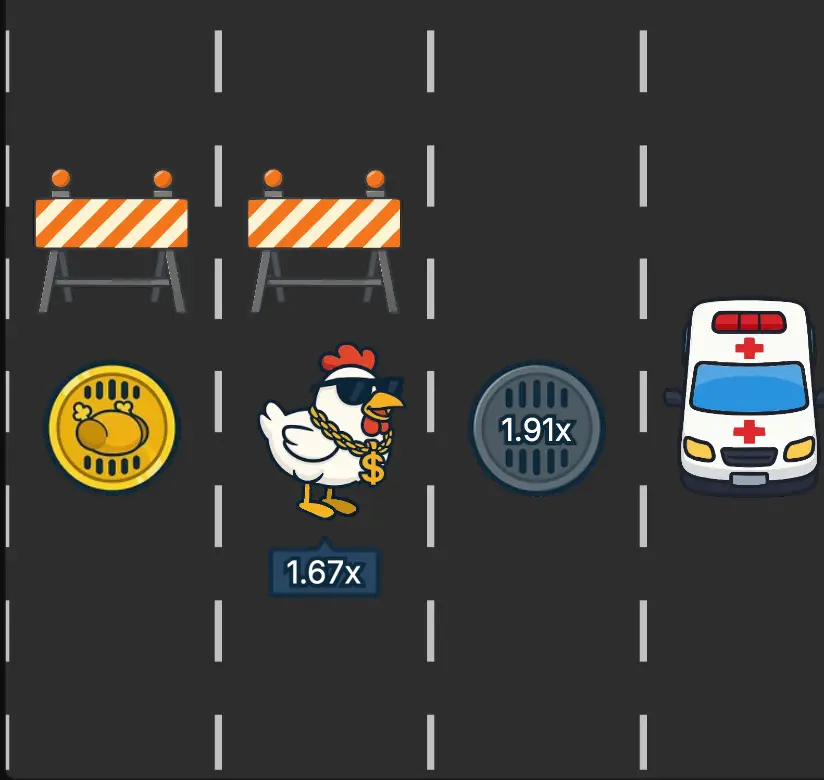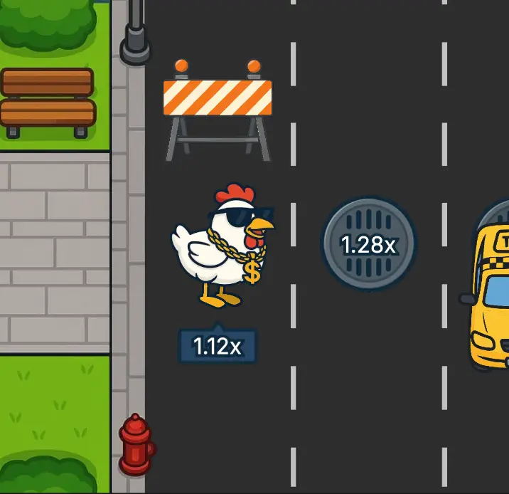 В Chicken Crash всё начинается с простой идеи: ты делаешь ставку, запускаешь цыплёнка — и наблюдаешь, как множитель растёт с каждым его шагом по дороге. На экране нет лишних элементов: только ставка, выбор уровня риска и большая кнопка «Играть». Это делает раунды быстрыми и интуитивными даже для новичков.